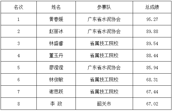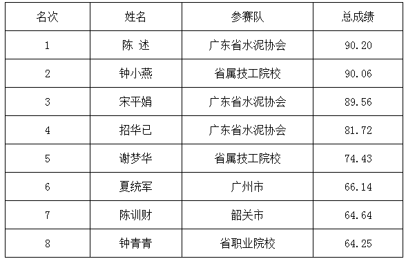 2010年廣東省化學(xué)檢驗(yàn)工技能大賽總決賽前八名(職工組)