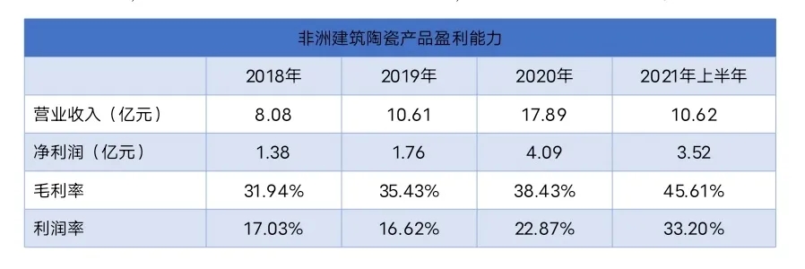 隨著非洲建筑陶瓷項(xiàng)目產(chǎn)能的不斷落地,科達(dá)制造非洲建材業(yè)務(wù)(以建筑陶瓷為主)不斷彰顯活力,凈利潤和毛利率維持較高水平且逐年提高,對公司利潤貢獻(xiàn)愈趨明顯。