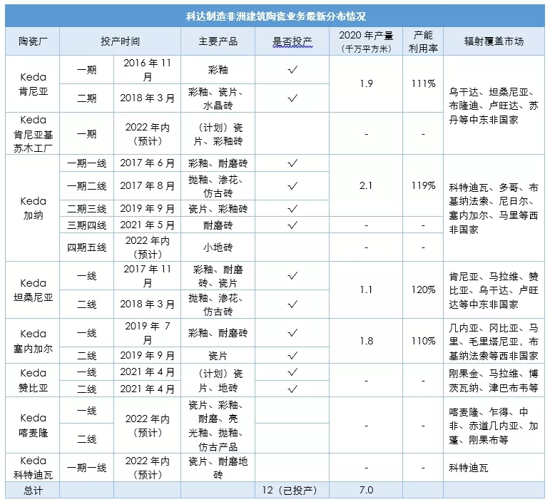 目前,科達(dá)制造在非洲投產(chǎn)的建筑陶瓷生產(chǎn)線12條,2021年上半年實(shí)際建筑陶瓷產(chǎn)量超3,800萬平方米,均處于滿產(chǎn)滿銷狀態(tài);在建待建生產(chǎn)線5條,預(yù)計(jì)均在2022年投產(chǎn)。