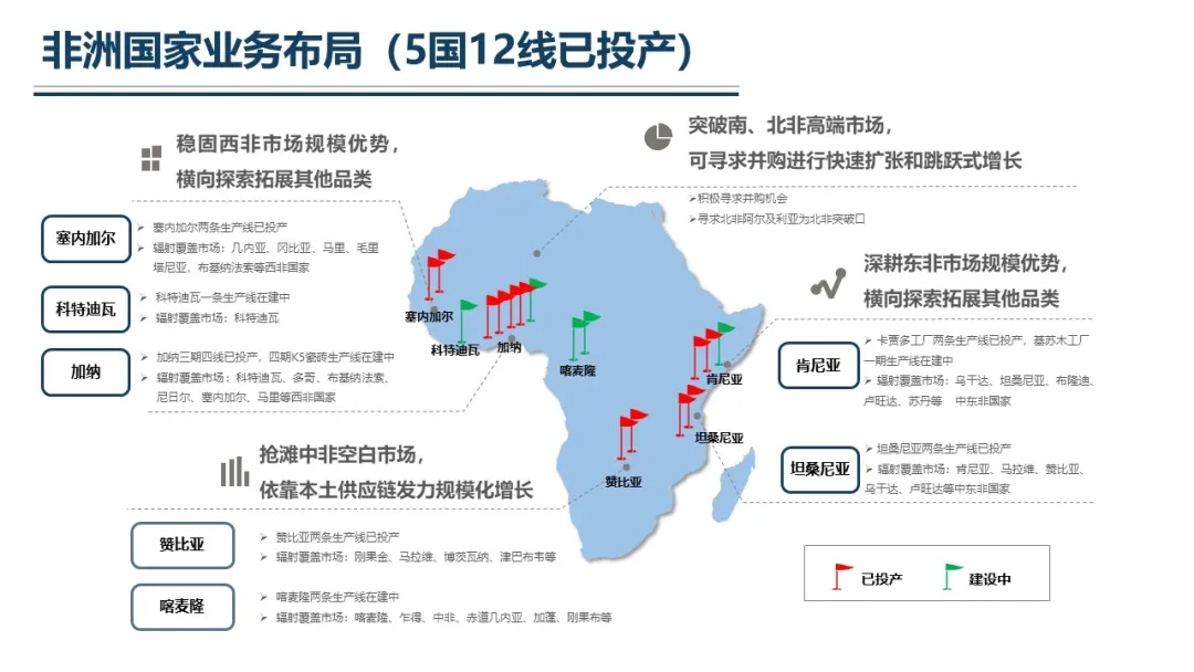 2-3年內(nèi),公司將于肯尼亞、加納、喀麥隆等地區(qū)繼續(xù)擴(kuò)大投資建設(shè),在非洲地區(qū)形成超過1億平方米的建筑陶瓷產(chǎn)能,并進(jìn)行新品類的研究探索;
